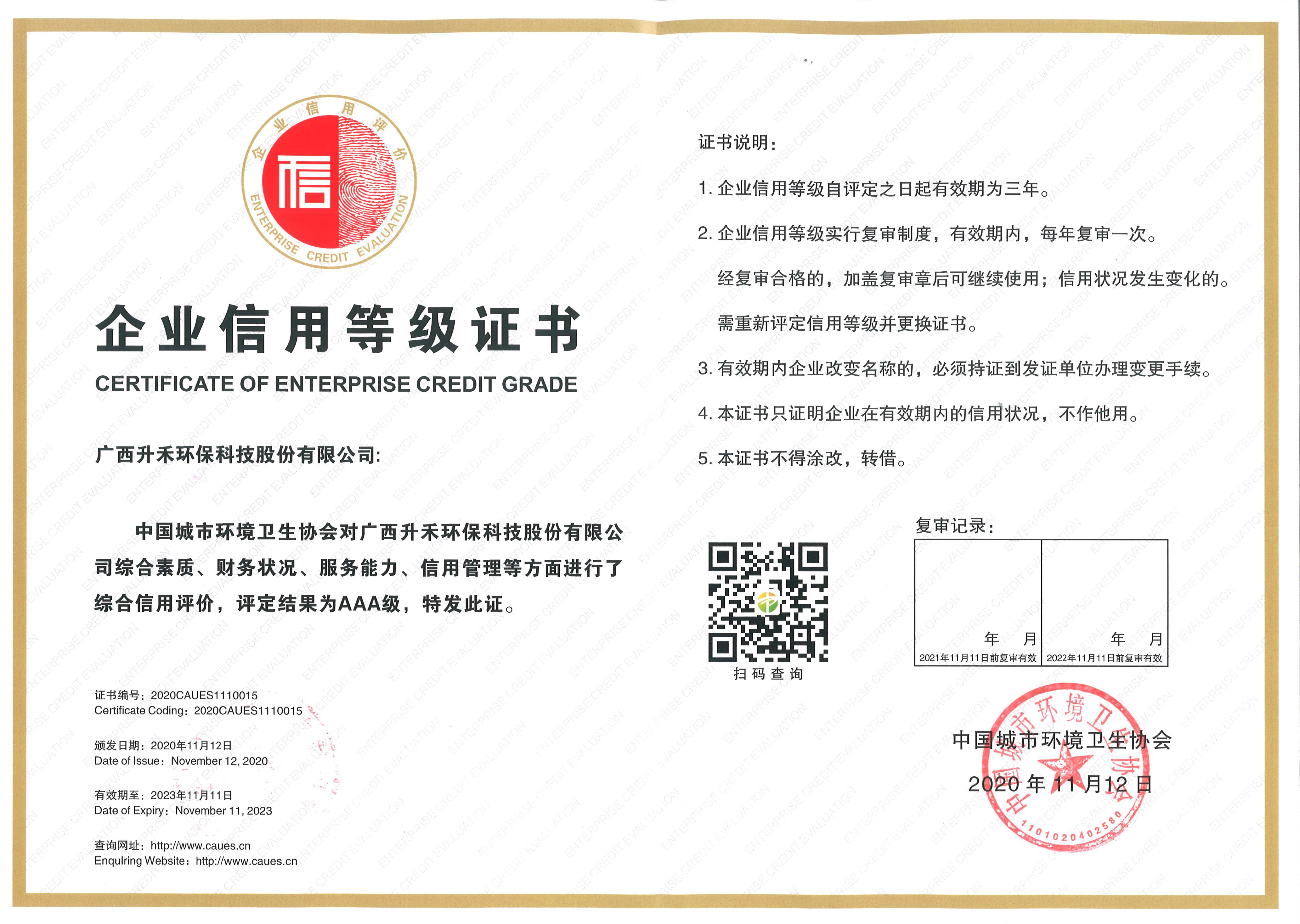 中環(huán)協(xié)企業(yè)信用等級證書